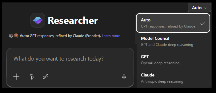 Critique is now the default experience in Researcher, when Auto mode is selected in the model picker by the user.